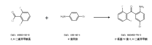 1.通过2,6-二氟苯甲酰氯和4-溴苯胺合成2-氨基-5-溴-2,6-二氟苯甲酮