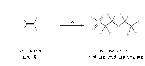 1.通过四氟乙烯合成2-(2-碘-四氟乙氧基)四氟乙基硫酰氟,收率约67%;