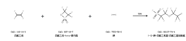 2.通过四氟乙烯、四氟乙烷-beta-磺内酯和碘合成2-(2-碘-四氟乙氧基)四氟乙基硫酰氟,收率约58%;