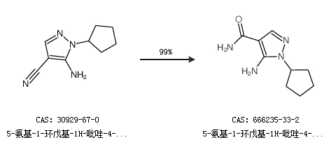 1.通过5-氨基-1-环戊基-1H-吡唑-4-甲腈合成5-氨基-1-环戊基-1H-吡唑-4-羧酰胺,收率约99%;