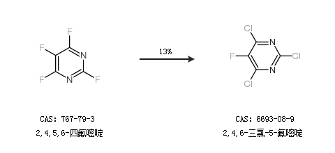 2.通过2,4,5,6-四氟嘧啶合成2,4,6-三氯-5-氟嘧啶,收率约13%;