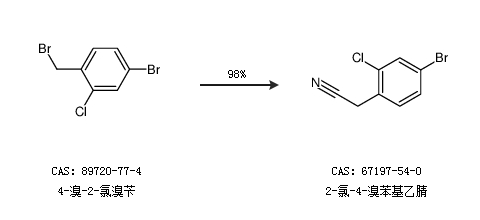 2.通过4-溴-2-氯溴苄合成2-氯-4-溴苯基乙腈,收率约98%;
