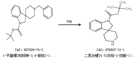 1.通过1-苄基螺[吲哚啉-3,4-哌啶]-1-羧酸叔丁酯合成二氮杂螺[4.5]癸烷-2-羧酸-1(2H)-羧酸,收率约79%;