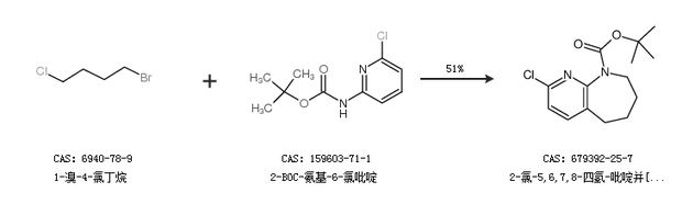 2.通过1-溴-4-氯丁烷和2-BOC-氨基-6-氯吡啶合成2-氯-5,6,7,8-四氢-吡啶并[2,3-b]氮杂卓-9-羧酸叔丁酯,收率约51%;