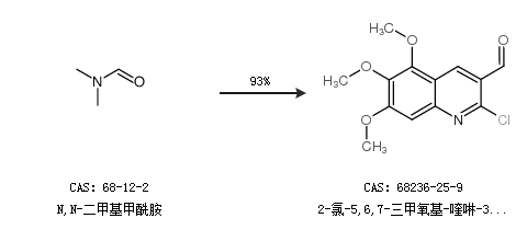 1.通过N,N-二甲基甲酰胺合成2-氯-5,6,7-三甲氧基-喹啉-3-甲醛,收率约93%;