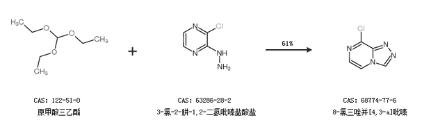 1.通过原甲酸三乙酯和3-氯-2-肼-1,2-二氢吡嗪盐酸盐合成8-氯三唑并[4,3-a]吡嗪,收率约61%;