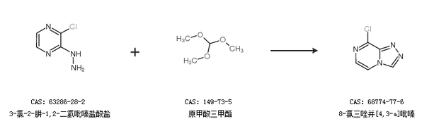 2.通过3-氯-2-肼-1,2-二氢吡嗪盐酸盐和原甲酸三甲酯合成8-氯三唑并[4,3-a]吡嗪