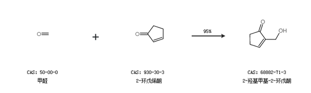 1.通过甲醛和2-环戊烯酮合成2-羟基甲基-2-环戊酮,收率约95%;