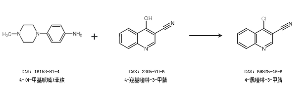 2.通过4-(4-甲基哌嗪)苯胺和4-羟基喹啉-3-甲腈合成4-氯喹啉-3-甲腈