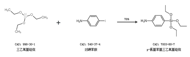 1.通过三乙氧基硅烷和对碘苯胺合成p-氨基苯基三乙氧基硅烷,收率约77%;