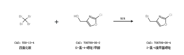 1.通过四溴化碳和(2-氯-4-噁唑)甲醇合成2-氯-4溴甲基噁唑,收率约91%;