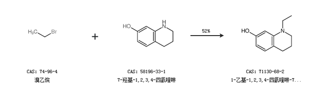 1.通过溴乙烷和7-羟基-1,2,3,4-四氢喹啉合成1-乙基-1,2,3,4-四氢喹啉-7-醇,收率约52%;