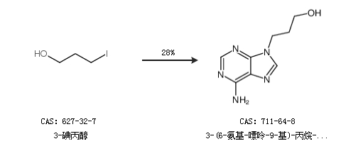 1.通过3-碘丙醇合成3-(6-氨基-嘌呤-9-基)-丙烷-1-醇,收率约28%;