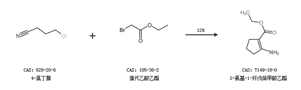 2.通过4-氯丁腈和溴代乙酸乙酯合成2-氨基-1-环戊烯甲酸乙酯,收率约12%;