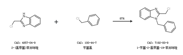 2.通过2-(氯甲基)苯并咪唑和苄基氯合成1-苄基-2-氯甲基-1H-苯并咪唑,收率约87%;