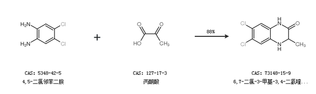 2.通过4,5-二氯邻苯二胺和丙酮酸合成6,7-二氯-3-甲基-3,4-二氢喹喔啉-2(1H)-酮,收率约88%;
