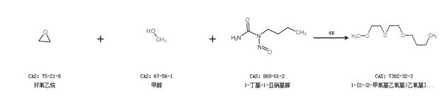 2.通过环氧乙烷、甲醇和1-丁基-1-亚硝基脲合成1-[2-(2-甲氧基乙氧基)乙氧基]丁烷,收率约4%;