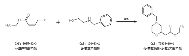 2.通过4-溴巴豆酸乙酯和N-苄基乙醇胺合成(4-苄基吗啉-2-基)乙酸乙酯,收率约42%;
