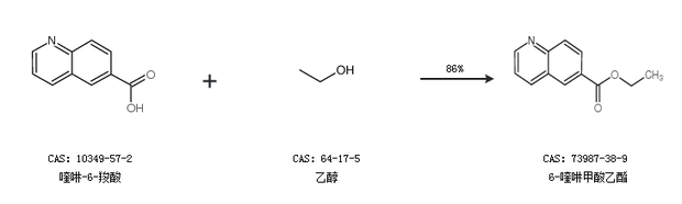1.通过喹啉-6-羧酸和乙醇合成6-喹啉甲酸乙酯,收率约86%;