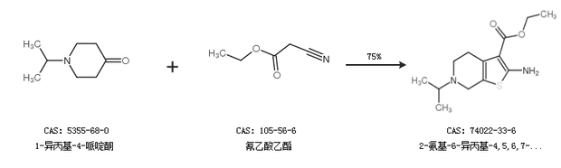 1.通过1-异丙基-4-哌啶酮和氰乙酸乙酯合成2-氨基-6-异丙基-4,5,6,7-四氢噻吩并-[2,3-c]吡啶-3-羧酸乙酯,收率约75%;