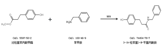 1.通过对羟基苯丙酸甲酯和苯甲胺合成3-(4-羟苯基)-N-苄基丙酰胺,收率约96%;