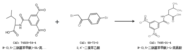2.通过N-(3,5-二硝基苯甲酰)-DL-亮氨酸和2,4''-二溴苯乙酮合成N-(3,5-二硝基苯甲酰)-L-亮氨酸
