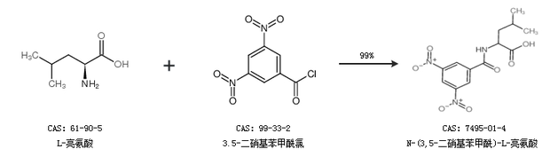 1.通过L-亮氨酸和3.5-二硝基苯甲酰氯合成N-(3,5-二硝基苯甲酰)-L-亮氨酸,收率约99%;