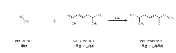 1.通过甲醇和5-甲基-2-己烯酸合成5-甲基-2-己烯甲酯,收率约65%;
