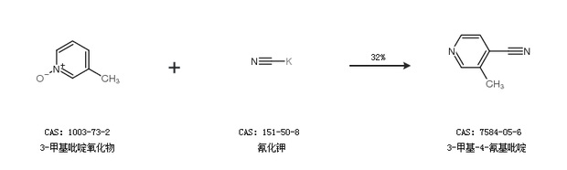 1.通过3-甲基吡啶氧化物和氰化钾合成3-甲基-4-氰基吡啶,收率约32%;