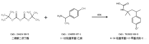 1.通过二碳酸二叔丁酯和1-(对羟基苯基)乙胺合成4-(4-羟基苯基)-2-甲基戊烷-2-氨基甲酸,收率约65%;