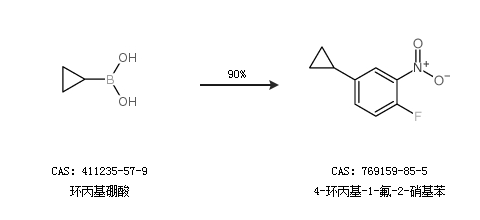 1.通过环丙基硼酸合成4-环丙基-1-氟-2-硝基苯,收率约90%;