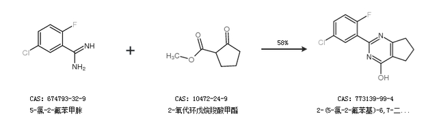 1.通过5-氯-2-氟苯甲脒和2-氧代环戊烷羧酸甲酯合成2-(5-氯-2-氟苯基)-6,7-二氢-5H-氯戊基[d]嘧啶-4-醇,收率约58%;
