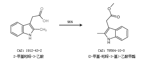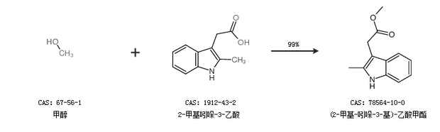 2.通过甲醇和2-甲基吲哚-3-乙酸合成(2-甲基-吲哚-3-基)-乙酸甲酯,收率约99%;