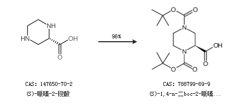 1.通过(S)-哌嗪-2-羧酸合成(S)-1,4-n-二boc-2-哌嗪-2-羧酸,收率约96%;