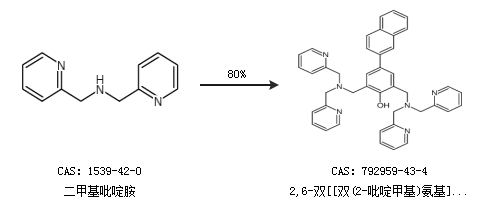 1.通过二甲基吡啶胺合成2,6-双[[双(2-吡啶甲基)氨基]甲基]-4-(2-萘)苯酚,收率约80%;