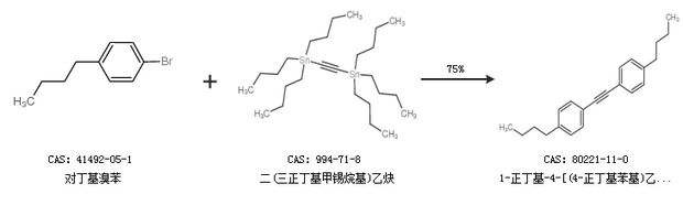 1.通过对丁基溴苯和二(三正丁基甲锡烷基)乙炔合成1-正丁基-4-[(4-正丁基苯基)乙炔基]苯,收率约75%;
