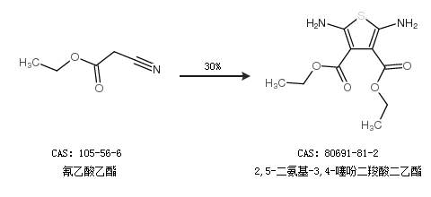 1.通过氰乙酸乙酯合成2,5-二氨基-3,4-噻吩二羧酸二乙酯,收率约30%;