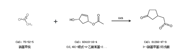 2.通过硝基甲烷和(1S,4R)-顺式-4-乙酰氧基-2-环戊烯-1-醇合成3-(硝基甲基)环戊酮,收率约64%;