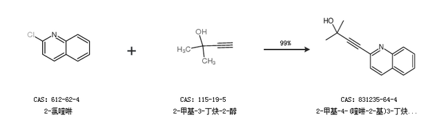 1.通过2-氯喹啉和2-甲基-3-丁炔-2-醇合成2-甲基-4-(喹啉-2-基)3-丁炔-2-醇,收率约99%;