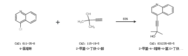 1.通过4-氯喹啉和2-甲基-3-丁炔-2-醇合成2-甲基-4-(喹啉-4-基)3-丁炔-2-醇,收率约83%;
