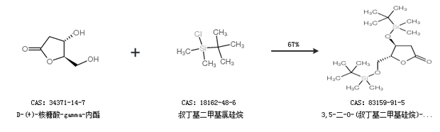 2.通过D-(+)-核糖酸-gamma-内酯和叔丁基二甲基氯硅烷合成3,5-二-O-(叔丁基二甲基硅烷)-2-脱氧-D-核糖酸-1,4-内酯,收率约67%;