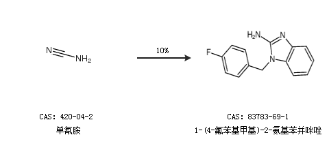 1.通过单氰胺合成1-(4-氟苯基甲基)-2-氨基苯并咪唑,收率约10%;