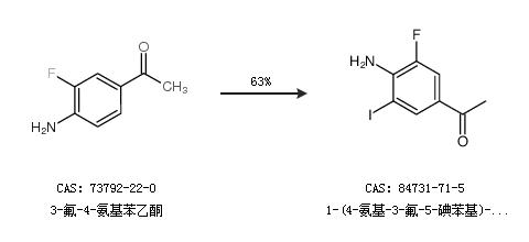 1.通过3-氟-4-氨基苯乙酮合成1-(4-氨基-3-氟-5-碘苯基)-1-乙酮,收率约63%;