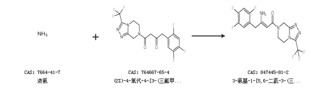2.通过液氨和(2Z)-4-氧代-4-[3-(三氟甲基)-5,6-二氢-[1,2,4]三唑并[4,3-a]吡嗪-7-(8H)-基]-1-(2,4,5-三氟苯基)丁-2-酮合成3-氨基-1-[5,6-二氢-3-(三氟甲基)-1,2,4-噻唑并[4,3-a]吡嗪-7(8H)-基]-4-(2,4,5-三氟苯基)-2-丁烯-1-酮