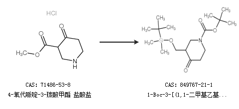 1.通过4-氧代哌啶-3-羰酸甲酯 盐酸盐合成1-Boc-3-[(1,1-二甲基乙基) 二甲基甲硅烷基氧基甲基]-哌啶-4-酮