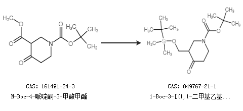 2.通过N-Boc-4-哌啶酮-3-甲酸甲酯合成1-Boc-3-[(1,1-二甲基乙基) 二甲基甲硅烷基氧基甲基]-哌啶-4-酮