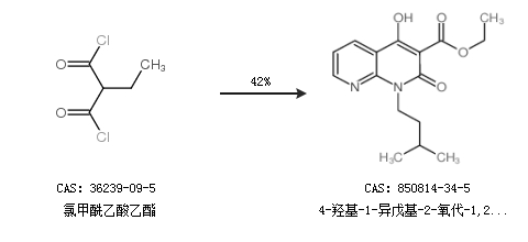 1.通过氯甲酰乙酸乙酯合成4-羟基-1-异戊基-2-氧代-1,2-二氢-1,8-萘啶-3-羧酸乙酯,收率约42%;