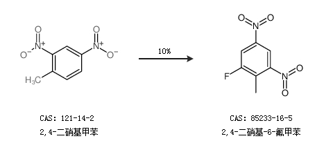 1.通过2,4-二硝基甲苯合成2,4-二硝基-6-氟甲苯,收率约10%;