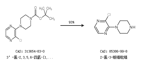 英文别名 2-chloro-3-(piperazin-1-yl)pyrazine;1-(3-chloropyrazin-2-yl)piperazine;1-(3-Chloro-2-pyrazinyl)piperazine;2-CHLORO-3-(PIPERAZINYL)PYRAZINE;3''-chloro-3,4,5,6-tetrahydro-2H-[1,2'']bipyrazinyl;3''-chloro-3,4,5,6-tetrahydro-2H-[1,2'']bipyrazine;2-chloro-3-(1-piperazinyl)pyrazine;
