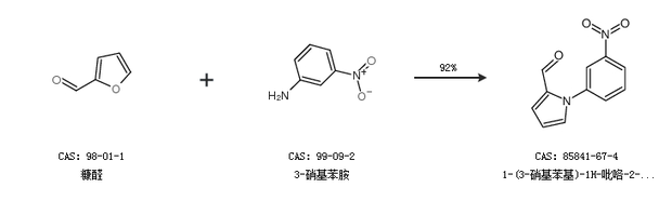 1.通过糠醛和3-硝基苯胺合成1-(3-硝基苯基)-1H-吡咯-2-甲醛,收率约92%;